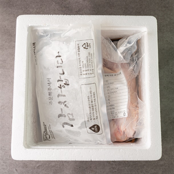 중량/사이즈 : 생닭 1kg, 냉동 문어 1마리(370g~430g급), 전복 200g(4-7미내외), 냉동 흰다리새우 4미, 약재 1팩